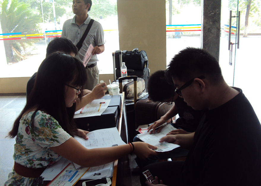 31日早上7:45,值班同学替换走了在迎新岗位上已经坚守了一晚的优秀党员,新的一天的迎新工作又正式开始。随着太阳的升高,南华广场上陆续热闹起来,各迎新点也逐渐忙碌起来。广场上迎新点的同学们面带微笑,为学弟学妹们做引导,带领他们前往九教大厅报到。大厅里亦是一片热情,信息搜集组和材料整理组的同学认真而有序的为新生服务,还有专门负责为学弟学妹搬行囊的同学,他们给家长送座,倒水,忙的不亦乐乎,然而整个过程却井然有序,忙而不乱。伟德的彭建南书记还拿出了他的相机,为新生和其父母合影留念,对他们的到来表示热烈的欢迎。