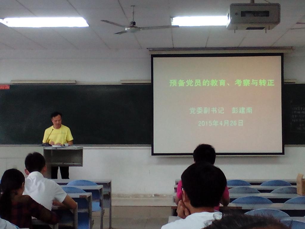 4月26日下午3:00伟德bv1946官网党委副书记彭建南于9-302教室,给学生党员上党课,主要讲《预备党员的教育、考察与转正》,本科学生党员和研究生党员到课学习。