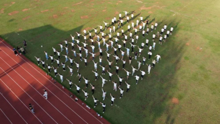 恰同学少年,风华正茂,150名同学组成的方阵跳起本草纲目健身操,尽显青春活力,展现了新青年良好的精神风貌和昂扬的斗志。