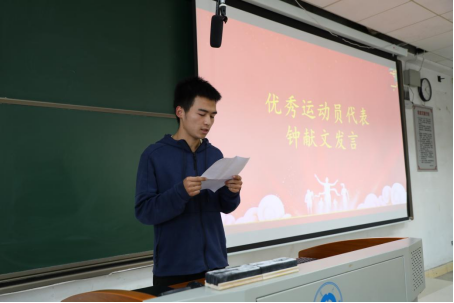 优秀运动员代表钟献文同学发言,他回顾了参赛经历,表示:“昂扬斗志、不屈不挠、克服一切困难,是我们取得胜利的秘诀。在体育比赛中感受到体育竞技的魅力,是青春,是热血,未来也将秉持‘更高、更快、更强、更团结’的精神继续奋斗。”