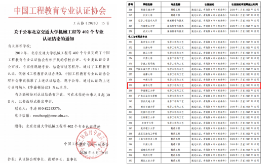 近日,教育部高等教育教学评估中心下发《关于公布2019年度通过工程教育认证专业名单的通知》教高评中心函[2020]55号),中国工程教育专业认证协会《关于公布北京交通大学机械工程等402个专业认证结论的通知》(工认协[2020]15号)。伟德bv1946官网化学工程与工艺专业经过学校自评、专家组现场考查、分委员会审议、认证结论审议委员会审议等程序,获得“通过认证,有效期6年(有条件)”的认证结论。
