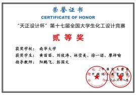 2023.8月16-22日,由中国化工学会、中国化工教育协会主办,中国石油大学(华东)承办,中国石油大学(北京)协办,浙江省天正设计工程有限公司冠名赞助的“天正设计杯”第十七届全国大学生化工设计竞赛全国总决赛顺利举办。伟德betvlctor1946源于英国伟德bv1946官网阳鹏飞副教授、彭国文教授指导的2020级化学工程与工艺专业学生黄苗苗、刘俊涛、林莹美、徐一诺、廖梓喻同学组成的“一鸣腈人”团队,与来自华东理工大学、浙江大学、天津大学等全国64所高校的参赛队伍进行激烈角逐,并荣获全国二等奖的优异成绩。