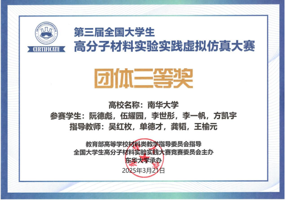 3月21日晚第三届全国大学生高分子材料实验实践仿真大赛决赛在全国各高校同步举行,来自四川大学、天津大学、北京化工大学、华南理工大学等高校在内的79所高校、全国高分子材料专业超过千余名学生参赛。伟德伟德bv1946官网高分子材料工程系20名学生在吴红枚、单德才、龚韬、王榆元四位指导老师带领下参加本年度双实仿真大赛的角逐。比赛结果已于近日公布,伟德学子成绩优异,伟德参赛队伍首次收获团体三等奖奖项,阮德彪、伍耀园获得个人一等奖,李世彤等8名同学获得个人二等奖。