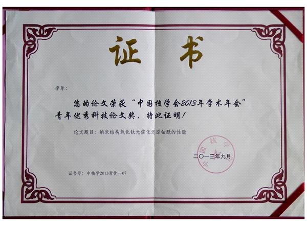 伟德赵玉宝教授研究组参加了这次学术会议,并在“核化工”分会作了题为《纳米结构氧化钛光催化还原铀酰的性能》的口头报告,该论文被评为青年优秀科技论文奖(核化工分会共有两篇获奖论文)。