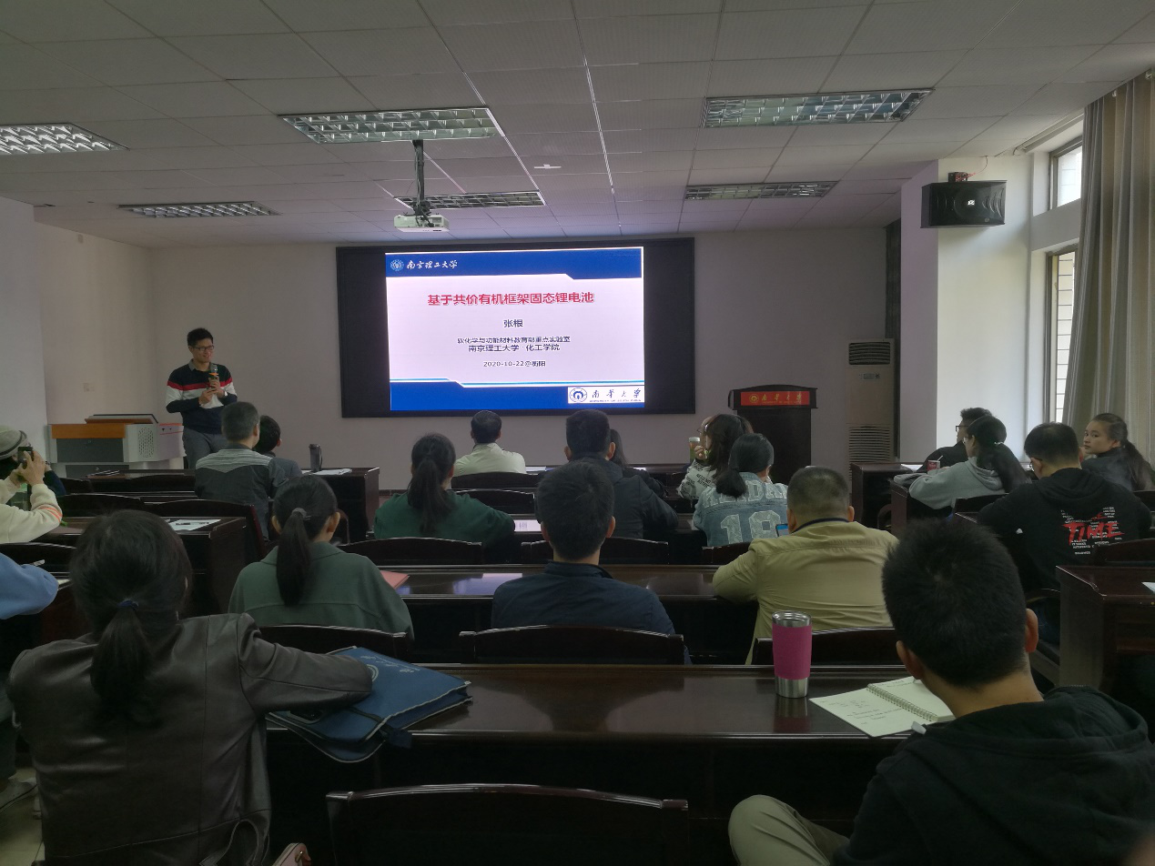 20201022日上午9点,由科学与学科建设部主办、化学与化工学院承办的“伟德betvlctor1946源于英国合并组建20周年暨建校62周年系列学术讲座”,邀请到张根教授化工楼411学术报告厅作了题为基于共价有机框架固态锂电池专题报告,报告由化学化工学院院长林英武教授主持,化工学院和其他院系教师以及研究生60人聆听了本次讲座。