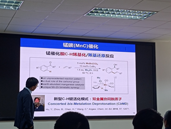 本次报告中,王从洋研究员从简单介绍锰族金属背景引入锰在合成化学中的研究现状,并提出目前的发展机遇和存在的挑战。随后,王从洋研究员对存在的科学问题以及当前的挑战重点说明了该课题组的研究策略,其中分为三点即:锰碱协同,锰酸协同和锰金属自身的独特性。之后主要介绍了课题组成员根据研究策略所做的烯炔加成反应,极性加成反应,氢转移反应的研究工作,目的是实现具有锰族金属特色的有机合成化学。最后王从洋研究员介绍了目前课题组正在做的研究工作,为响应国家号召,现主要从事催化固氮合成有机胺工作,从氮气到有机胺,发展具有特色的金属催化固氮化学体系。